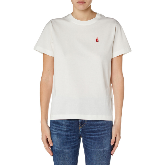 Women's clean-cut organic cotton T-shirt with a regular fit. The bubble-like 3D application on the chest features a distorted logo, as seen through a spread-out water drop.