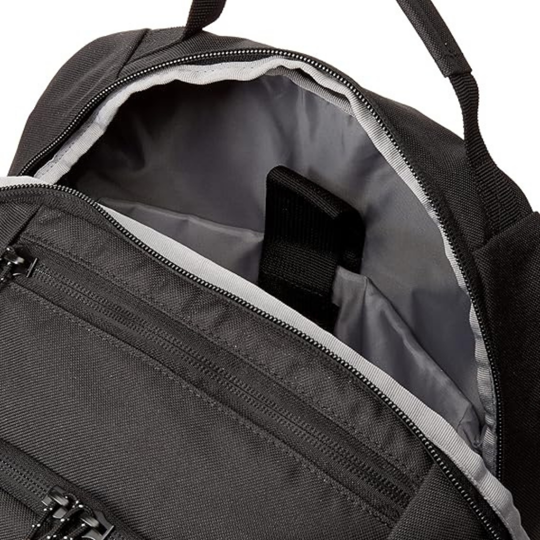 The 1969 Special 28L Large Backpack for Men is crafted from durable recycled polyester fabric. It features a spacious main compartment, a 15" laptop sleeve, and multiple pockets for organized storage. The padded back panel and adjustable shoulder straps ensure comfort for daily use.