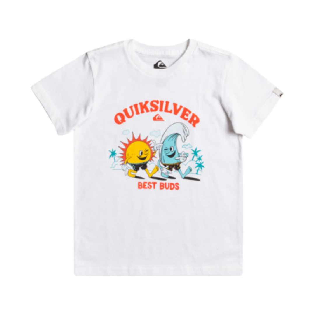 The Best Buds T-Shirt for Boys 2-7 in White is a versatile and breathable tee designed for everyday wear. Featuring lightweight cotton jersey fabric, a classic crew neckline, and a screen print on the chest, it combines comfort with a stylish look.