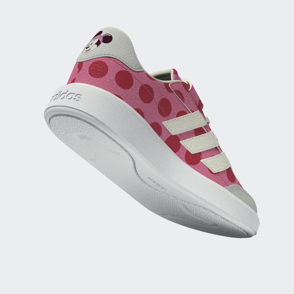 Kids' sneakers inspired by Disney's Minnie Mouse, featuring polka-dot design and signature bow.