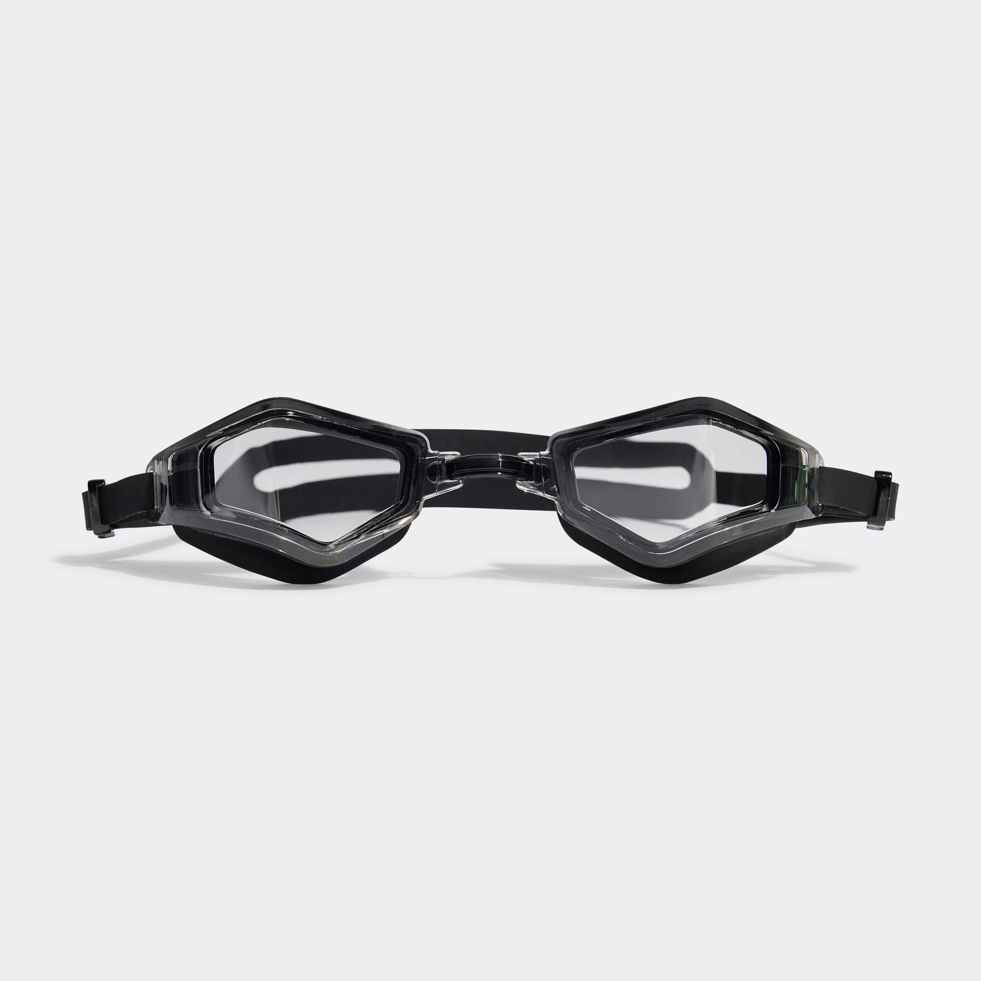 Swim goggles with molded silicone frame and adjustable nosepiece for comfort.