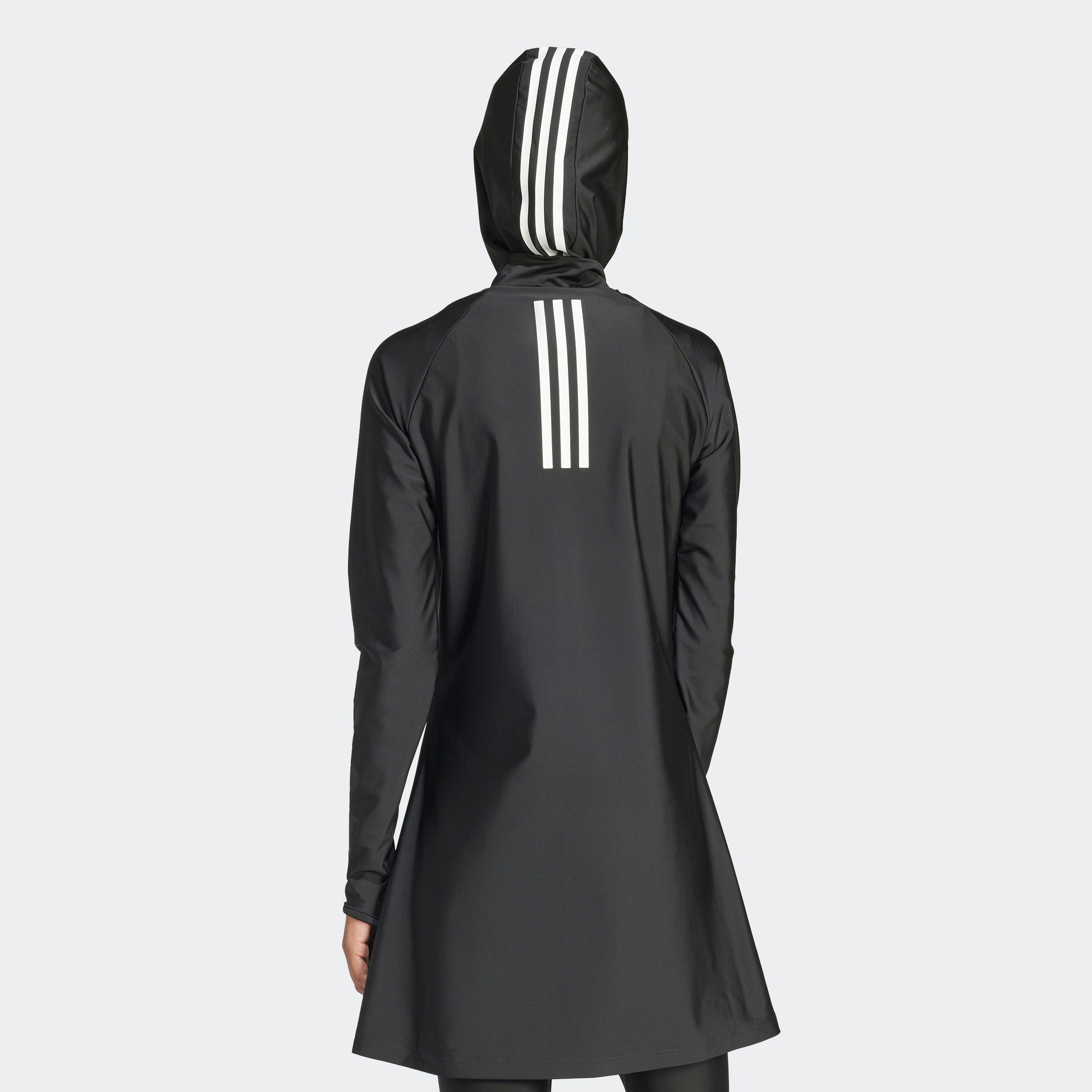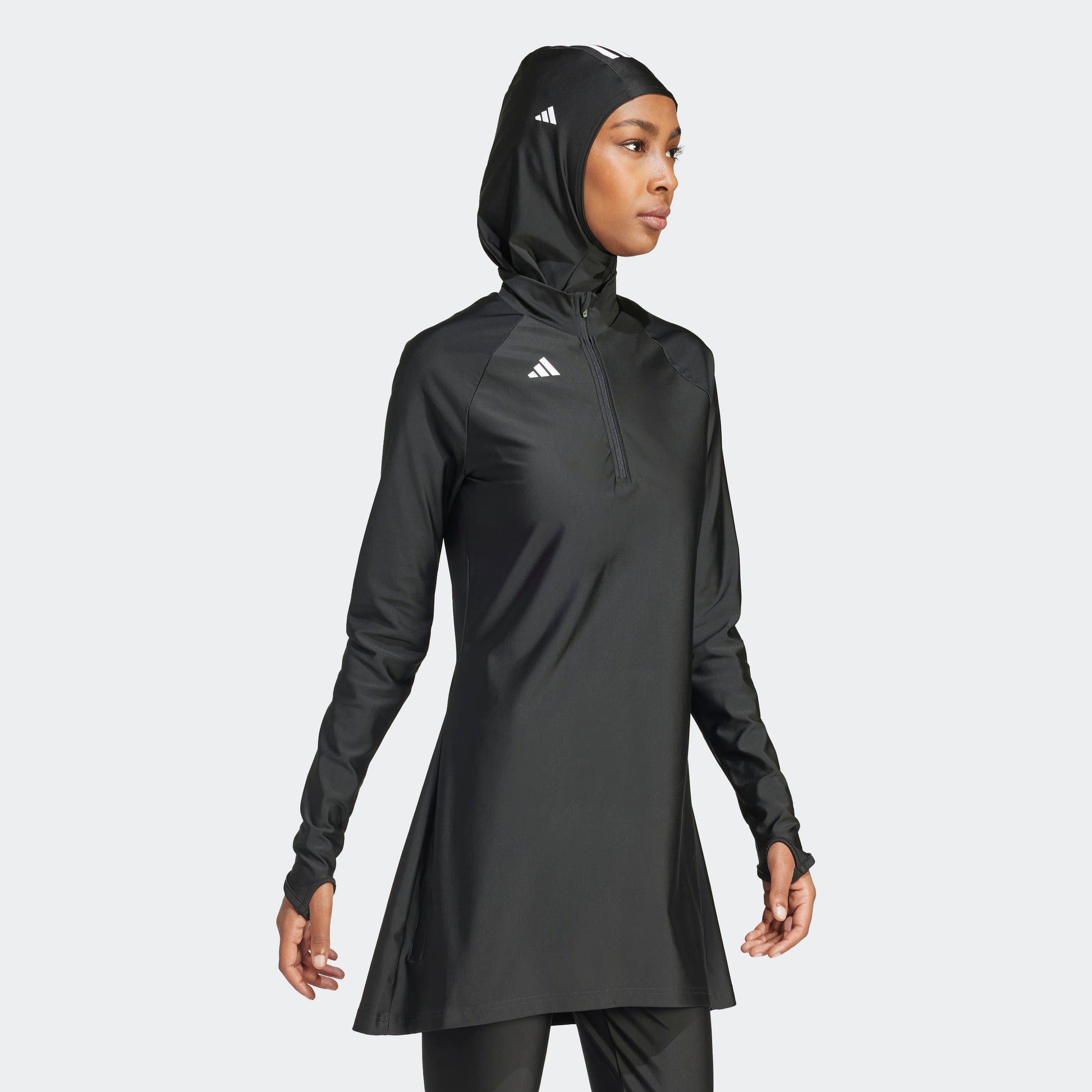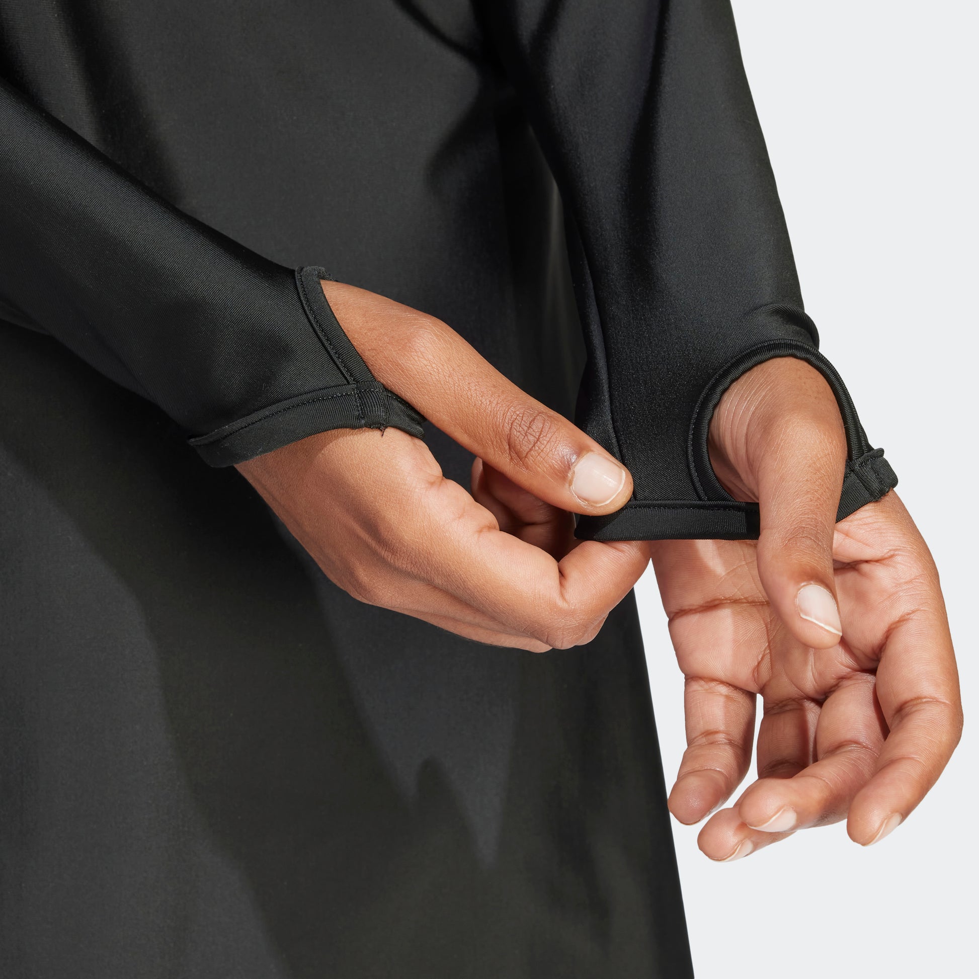 Long-sleeve swim top offering full coverage and chlorine resistance.
