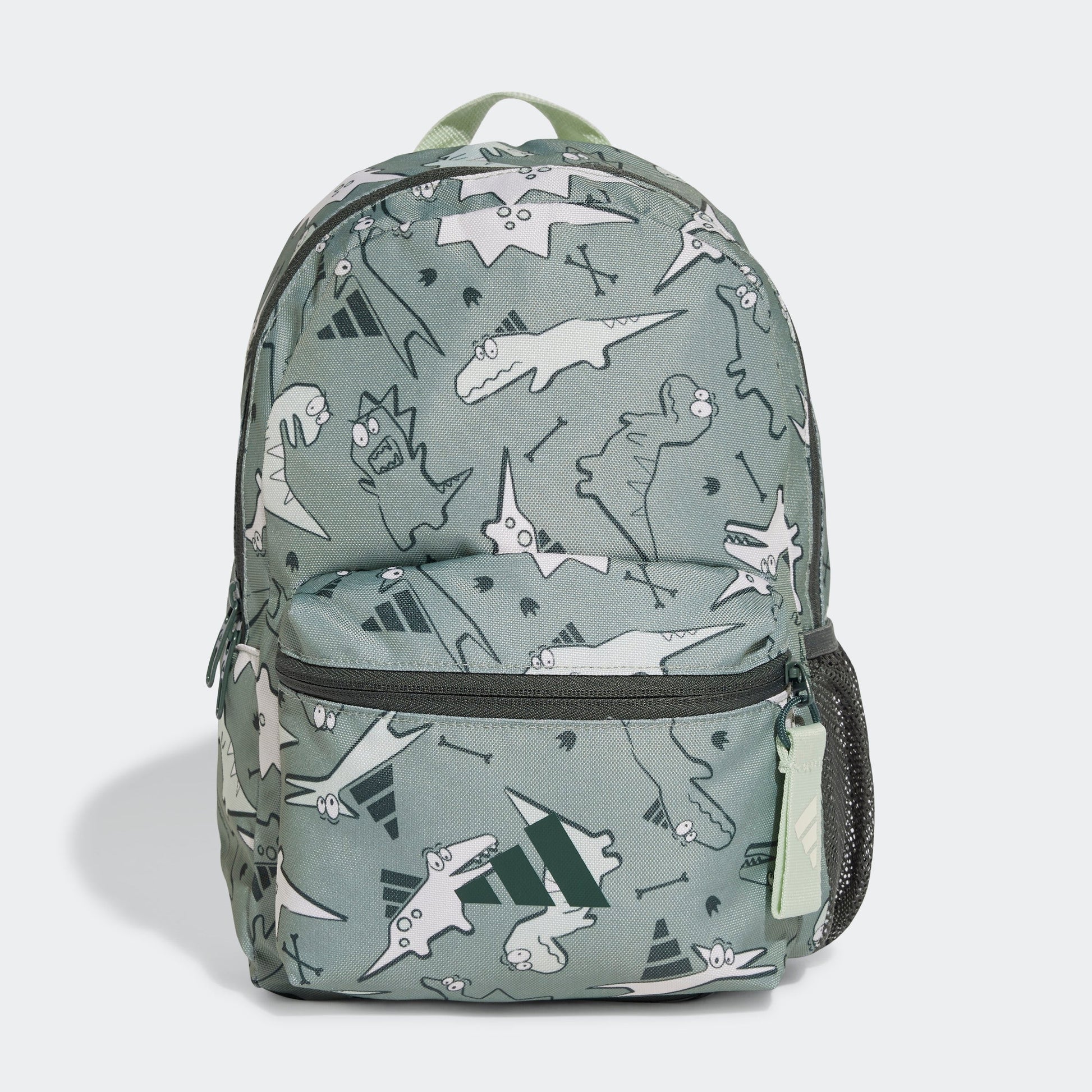 Kids' backpack with dinosaur print, adjustable straps, and multiple pockets.