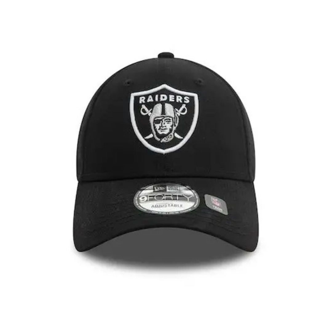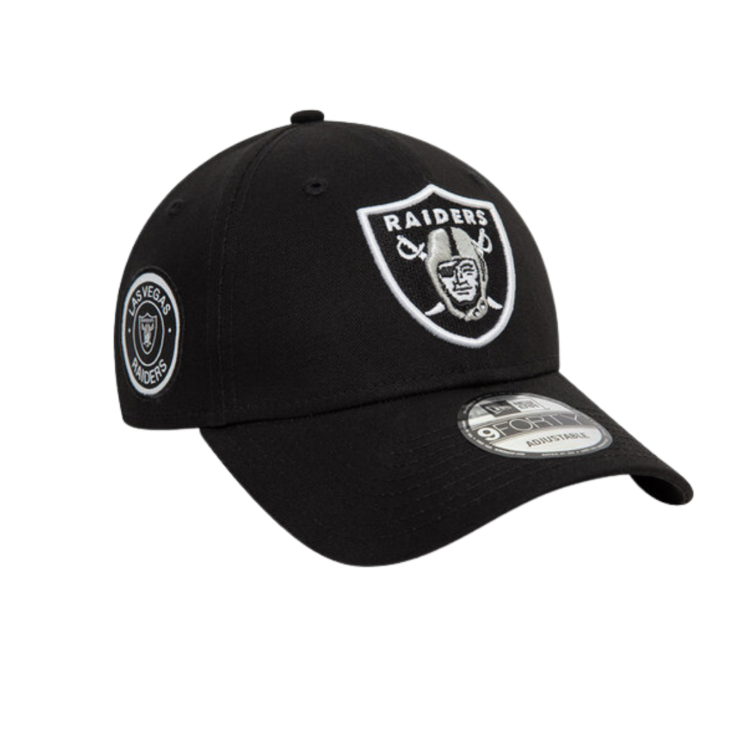 Red 9FORTY cap with Las Vegas Raiders logo and side patch, structured crown, curved visor, and adjustable strap.