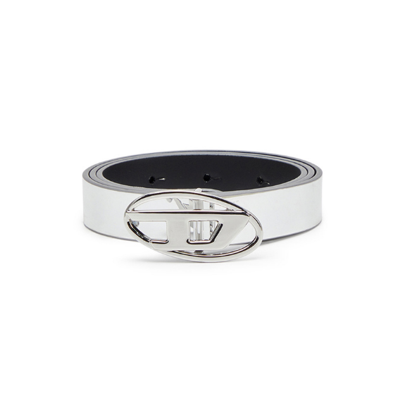 This women's belt gleams with a mirror-like shine. It's made from a combination of leather and synthetic material and has a metal 'oval D' buckle that blends in seamlessly.