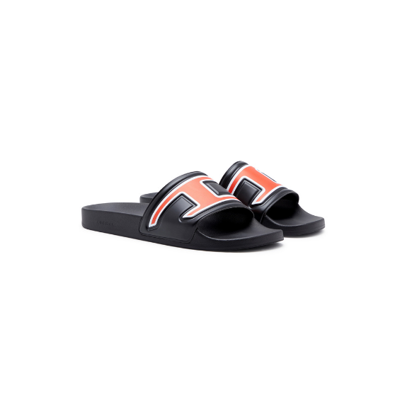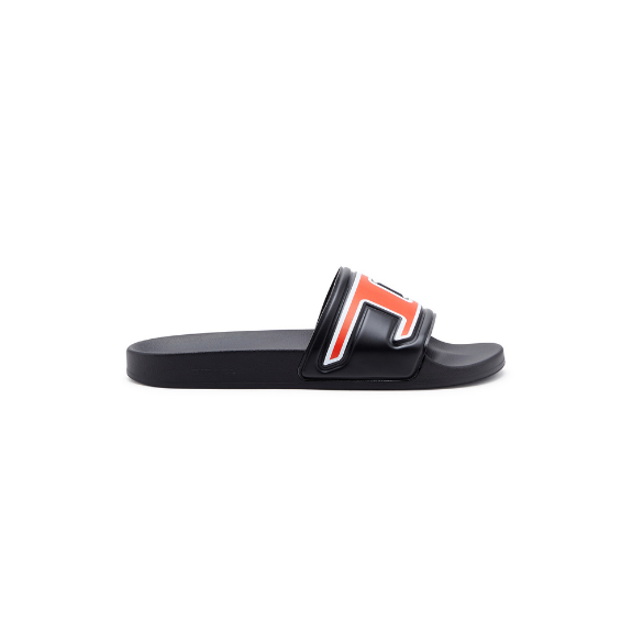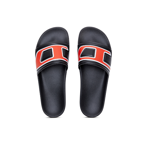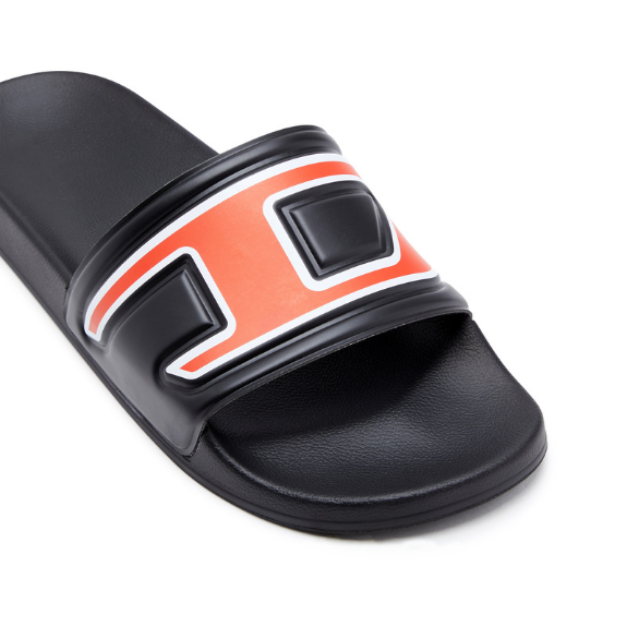 These men's black slides are styled with moulded footbeds and gripped logo soles. Their wide upper band is branded with an embedded D logo.