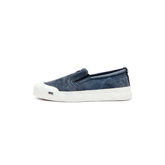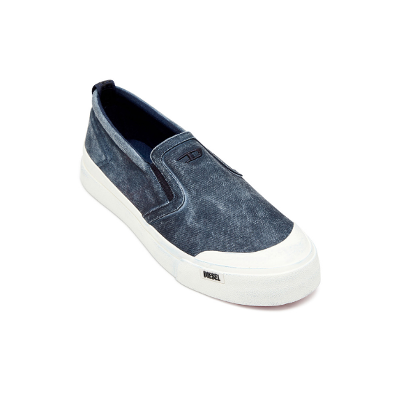 Men’s skater-style slip-on shoes made from pigment-dyed cotton canvas. Featuring a slimmer toe, thick rubber caps, and chunky soles with contrasting red bottoms. The embroidered D logo accents the upper for a signature touch.