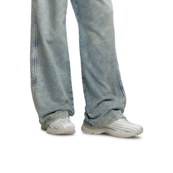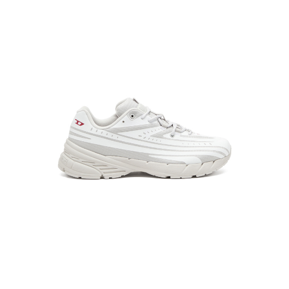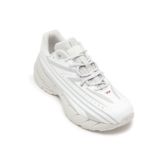 These women’s low-top trainers are crafted from durable ripstop in white and grey with red D logo accents. Featuring slightly squared-off toes, sweeping front-to-back lines, and a striped sole texture, they offer a clean yet dynamic look.